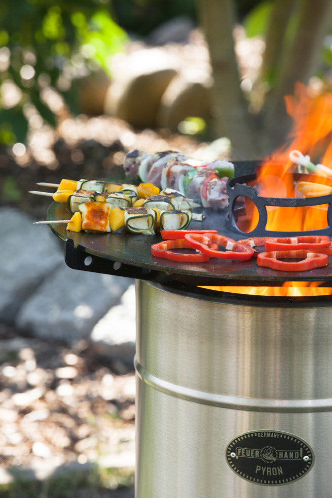 La plaque de cuisson de Feuerhand est conçue pour le tonneau Pyron et la vasque Tyropit. Le feu se propage par le bas dans le tonneau ou la barquette et porte la plaque à une température élevée unique. De plus, la taille de la plaque de cuisson et les différents effets de la chaleur créent différentes zones de chaleur. Plus tu places tes aliments à proximité de la croix de cuisson centrale, plus les températures sont élevées. Ainsi, il est possible d'obtenir une grande variabilité, de la saisie forte près du centre jusqu'à la post-cuisson sur le bord extérieur. Avec cette plaque de cuisson fabriquée en Allemagne, tu as une expérience de grillade d'un genre particulier, qui est déjà très appréciée en Espagne et en France.
